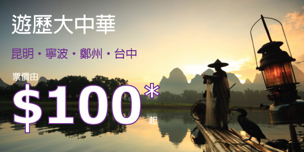 香港飛台中來回$310,連稅$895;鄭州$150,連稅$770;昆明/寧波$310,連稅$930