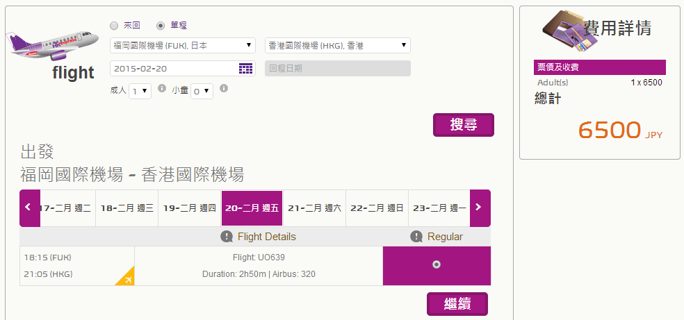 福岡飛香港單程6,500円,連稅同付款手續費7,840円(約$594)