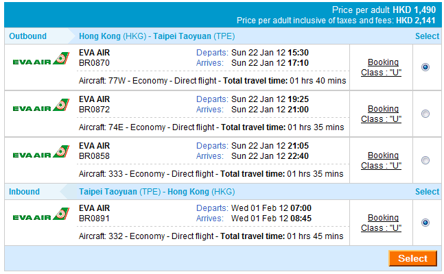 1月22-23日(年初二至三) 去程指定BR868 13:45、BR870 15:30、BR856 17:05、BR872 19:25、BR858 21:05