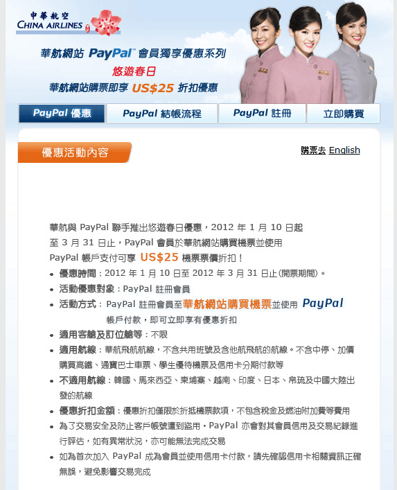 即日起至2011年12月31日,凡 PayPal 用戶於中華航空網站 購買機票並使用 PayPal 帳戶支付款項,即可享有HK$195 / US$25 的立即接扣優惠!