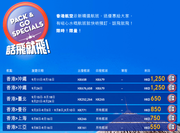 香港航空新一期”話飛就飛”優惠主打9月份出發
