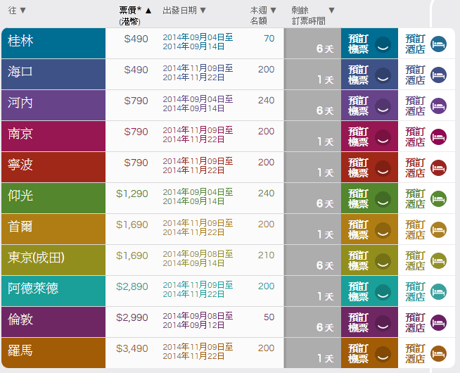 而桂林、河內、仰光、東京成田、倫敦係介乎9月4日至9日14日指定日子來回