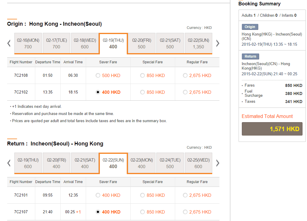 我們以2月19日(年初一)去,2月22日(年初四)返為例