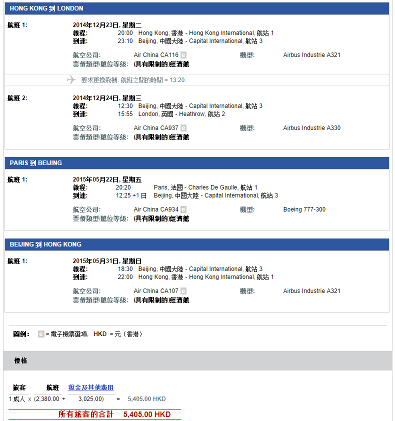 經我們測試,以12月23日經北京飛倫敦,5月22日由巴黎飛北京,5月31日由北京返香港