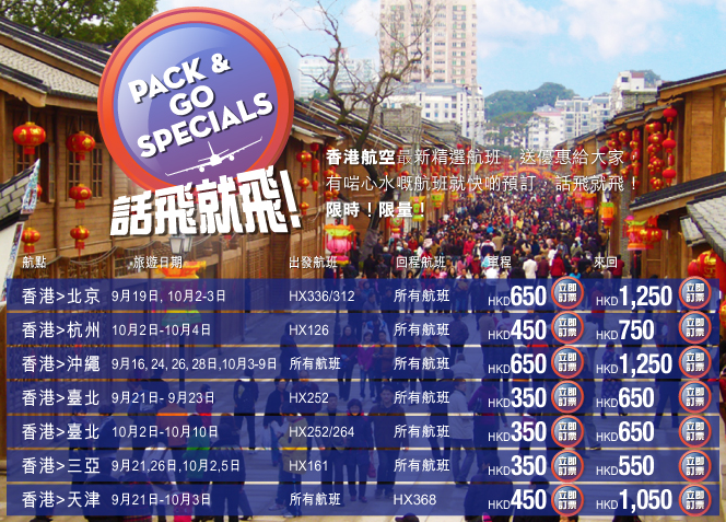 香港往返三亞$550,連稅$1,164;台北$650,連稅$1,229;杭州$750,連稅$1,364;天津$1,050,連稅$1,664;沖繩$1,250,連稅$1,826;北京$1,250,連稅$1,864