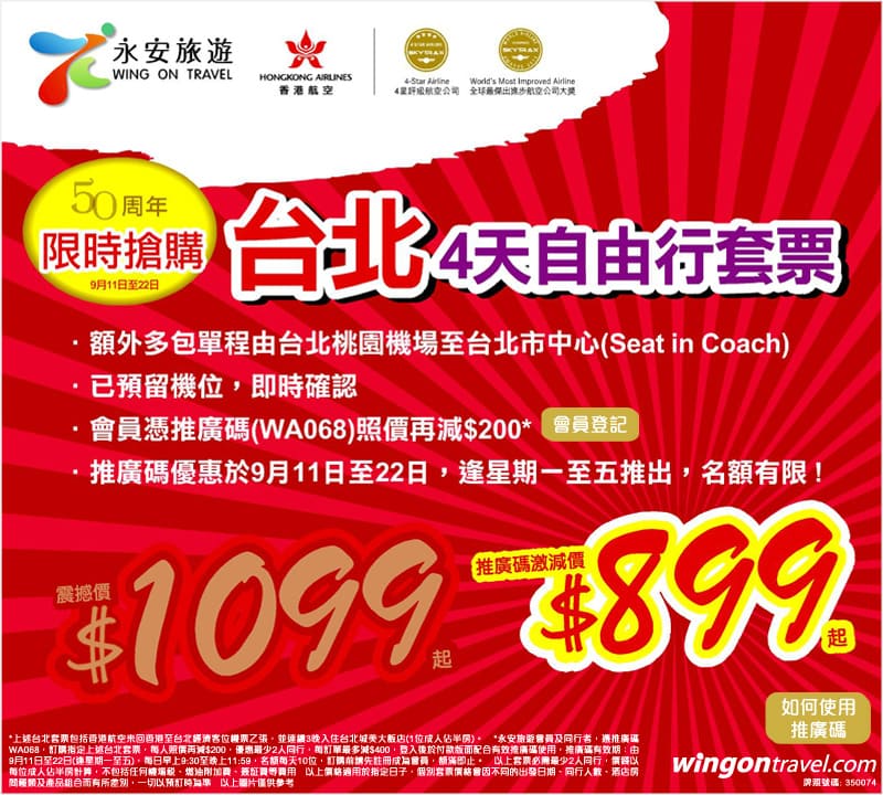 由9月11日至9月22日,逢星期一至五早上9:30開始,於付款頁輸入推廣碼「WA068」每位減$200,每訂單最高減$400,名額每日10個,整個推廣期共有80個名額