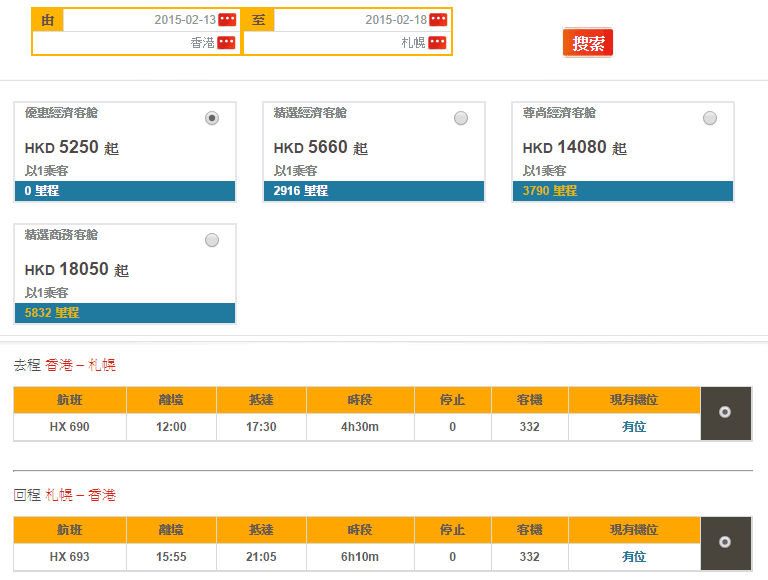香港直航往返北海道札幌$5,250,連稅$5,826