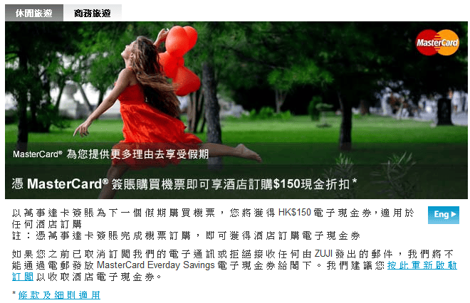 如 果 您 之 前 已 取 消 訂 閱 我 們 的 電 子 通 訊 或 拒 絕 接 收 任 何 由 ZUJI 發 出 的 郵 件 , 我 們 將 不 能 通 過 電 郵 發 放 MasterCard Everday Savings 電 子 現 金 券 給 閣 下 。 我 們 建 議 您 重 新 啟 動 訂 閱 以 收 取 酒 店 電 子 現 金 券。