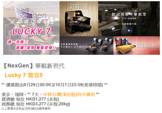 Lucky 7驚喜票第五擊!香港往返東京、福岡只需$1,277,加$2,000可upgrade坐商務艙 – 中華航空 (優惠至10月1日)