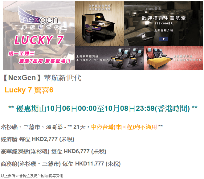 華航將會係星期一推出Lucky 7驚喜票第六擊優惠