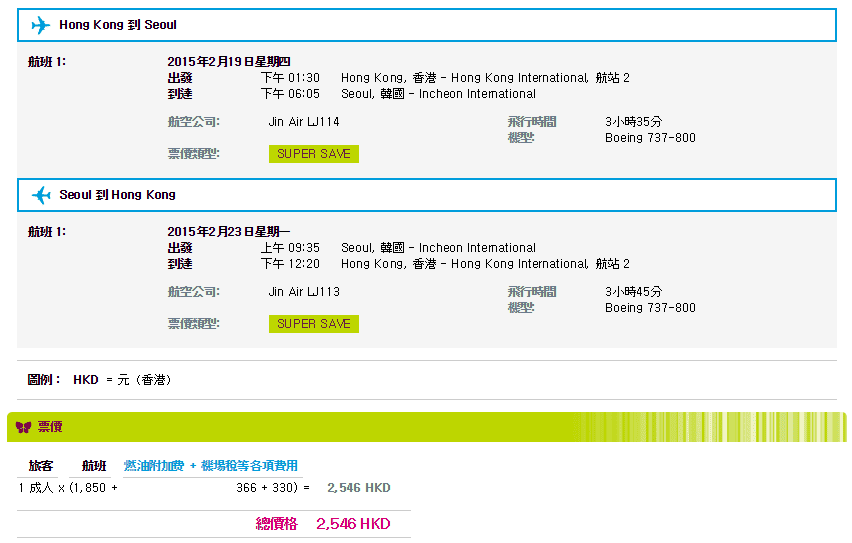 香港往返首爾只需$1,850,連稅$2,546