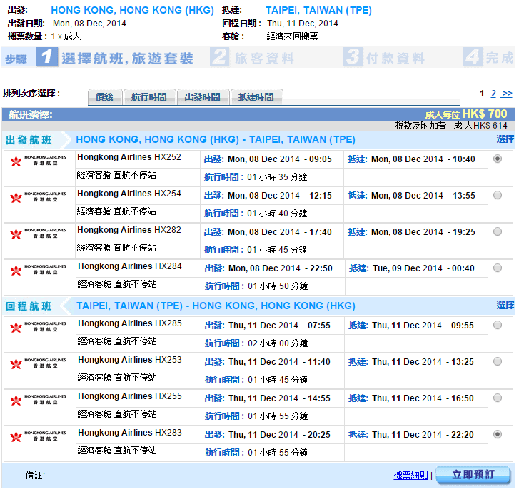 經我們測試,以台北12月8日出發,12月11日返回為例