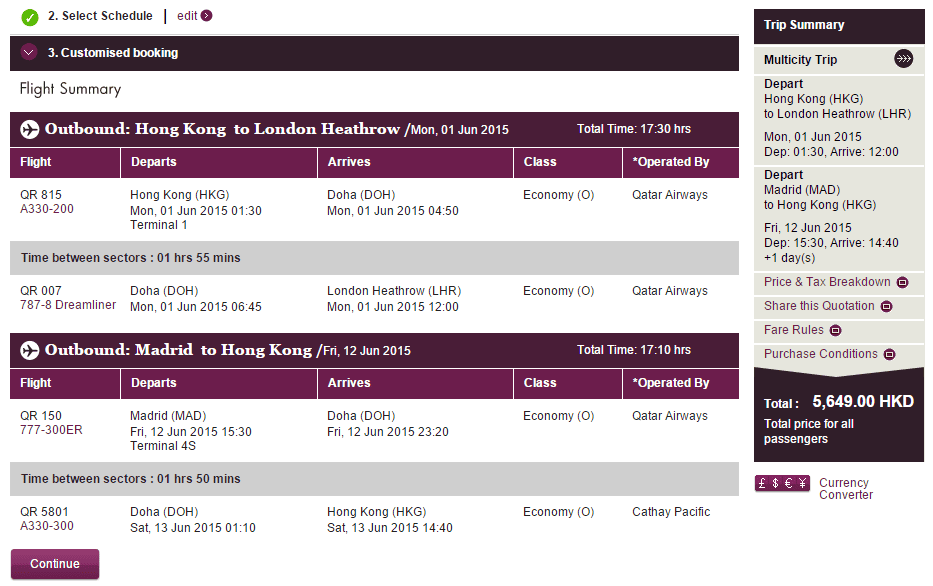 之後用官網首頁”Multi-city”功能再search,揀返之前所抄低既航班組合,咁樣就可以做到較低既機票價格