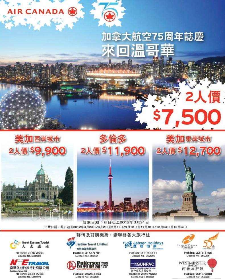 75周年誌慶 香港往返溫哥華二人同行機票每位$3,750 – 加拿大航空 (優惠至3月31日)