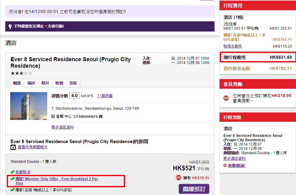 提提大家,免費早餐係會員獨家優惠,大家必須先登入HotelClub會員帳戶後,再重新search過先會見到有“獨家! Member Only Offer – Free Breakfast 2 Per Stay”可以預訂