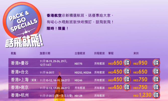 香港往返台北$650,上海/南京$750,曼谷$950,杭州$1,230 – 香港航空 (優惠至11月7日)