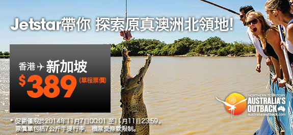 香港飛新加坡單程$389起,澳洲達爾文單程$792起 – Jetstar (優惠至11月11日)