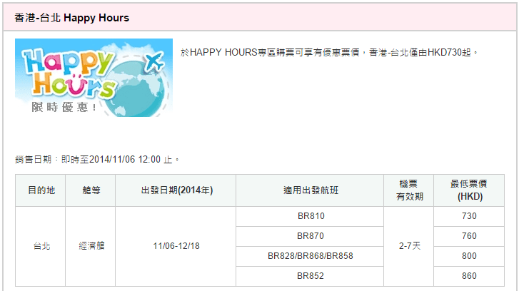 香港往返台北只需$730,連稅$1,272,去程限坐BR810 21:45-23:30(星期一、二、四、五)