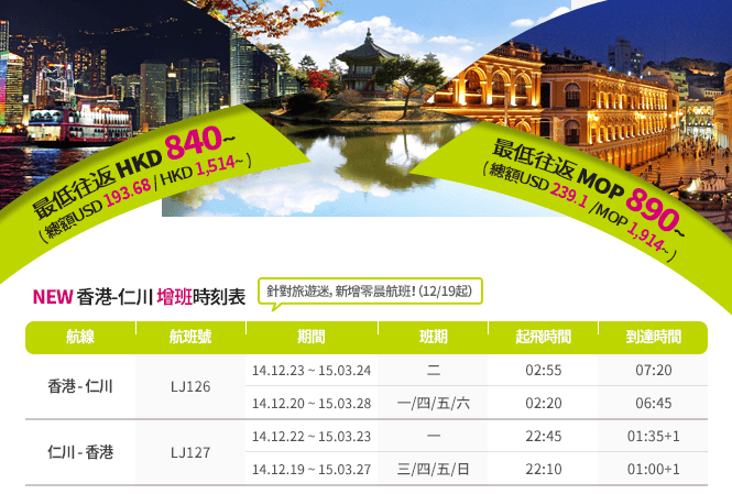 去程:LJ114 13:30-18:05 / LJ126 02:20-06:45 (一、四、五、六)