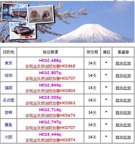 中華航空推出左喜瀛春既promotion,香港往返日本琉球、福岡、名古屋、宮崎、廣島等只需$2,312起(已包稅)
