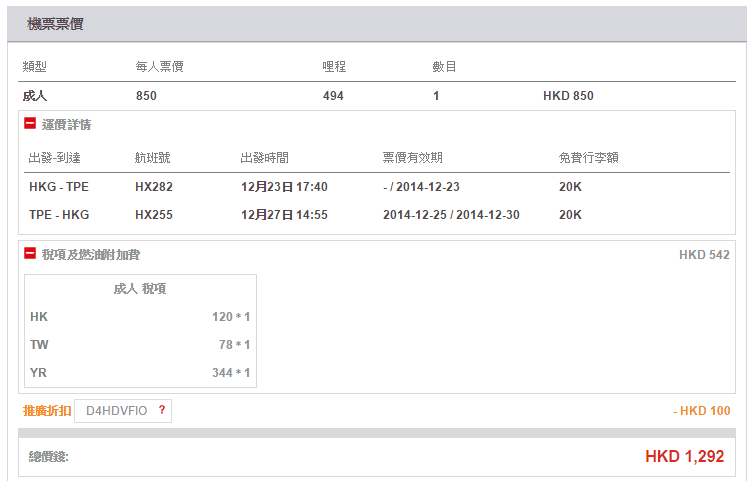 香港往返台北只需$850起,周末熱價減$100後,只需$750,連稅$1,292