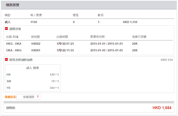 香港往返沖繩只需$1,150,連稅$1,684,價錢都幾抵下