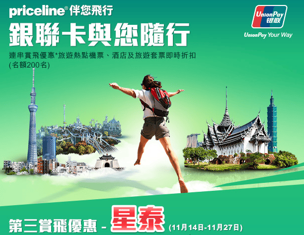 Priceline HK 同銀聯推出左賞飛優惠第三浪