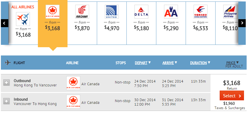 經我們測試,以溫哥華12月24日出發,12月30日返回為例
