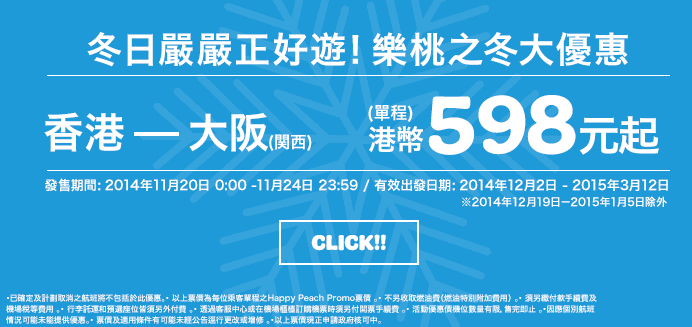 開賣啦!香港飛大阪單程只需$598 – 樂桃航空 (優惠至11月24日)
