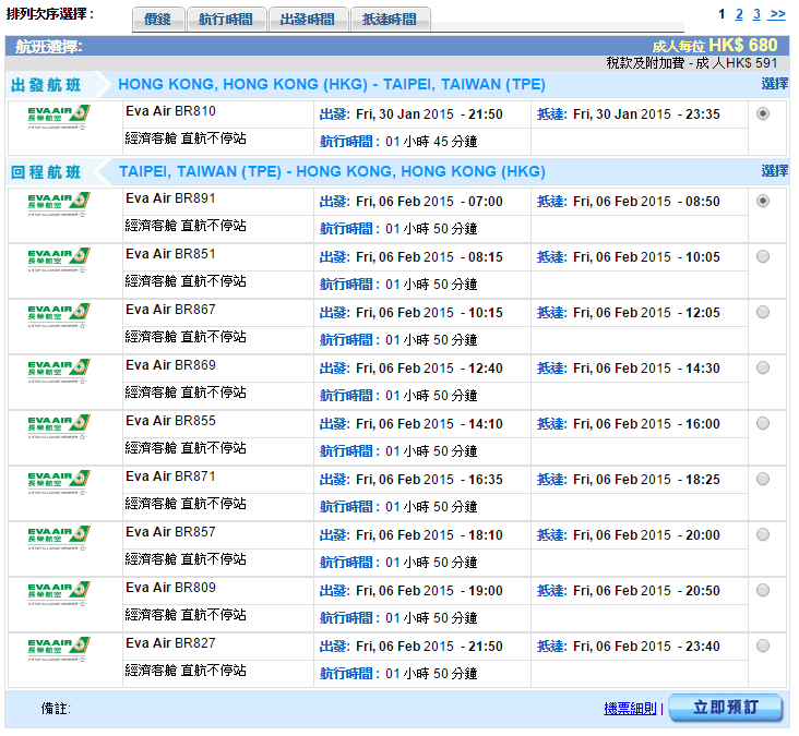 香港往返台北只需$680,連稅$1,212,去程限坐BR810 21:45-23:30(星期一、二、四、五)
