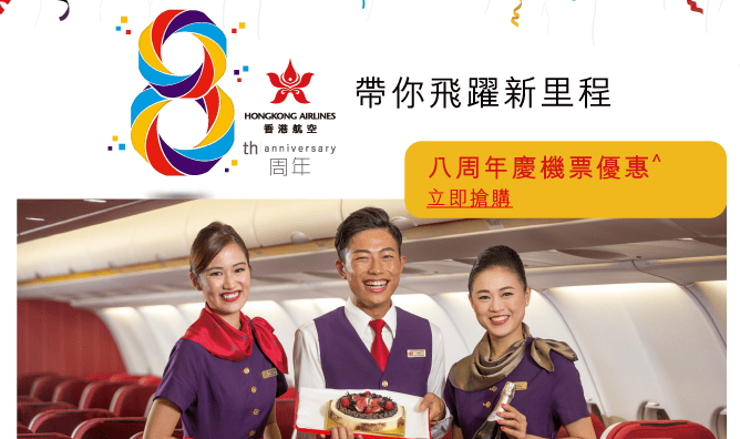 開搶啦!8周年優惠!台北$448起,曼谷$538起,沖繩$938起,峇里島$1,498,札幌$3,738 – 香港航空 (優惠至12月5日)