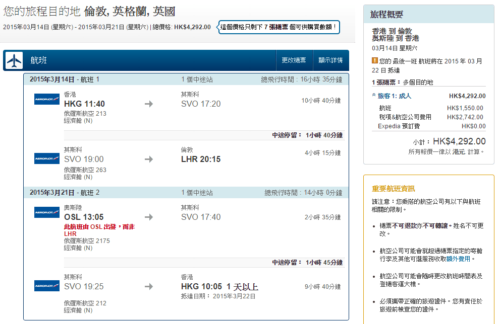 經我們測試,以3月14日倫敦入,3月21日奧斯陸走為例