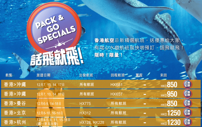 香港往返沖繩$850起,連稅$1,382起;曼谷$850,連稅$1,482;杭州$1,230,連稅$1,809;北京$1,250,連稅$1,829
