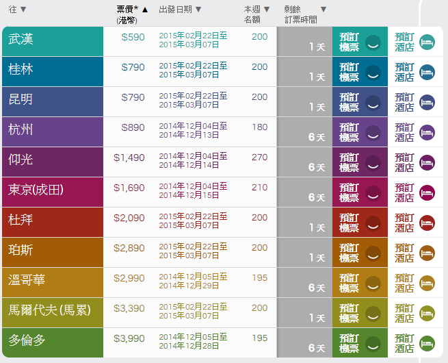 (武漢$590 連稅$1,112)、(桂林$790 連稅$1,312)、(昆明$790 連稅$1,312)、(杭州$890 連稅$1,412)、(仰光$1,490 連稅$2,026)、(東京$1,690 連稅$2,271)、(杜拜$2,090 連稅$3,647)、(珀斯$2,890 連稅$4,897)、 (溫哥華$2,990 連稅$4,695)、(馬爾代夫$3,390 連稅$4,961)、(多倫多$3,990 連稅$5,746)