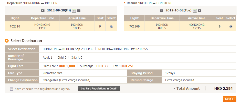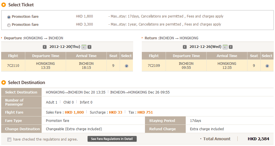 佢地每班航班都有一定數量既機票以 $1,800 發售,計埋稅分別係 $2,584 (首爾) 同 $2,548 (釜山)