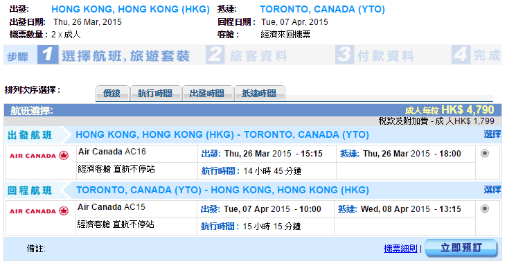 經我們測試,以多倫多3月26日出發,4月7日返回為例