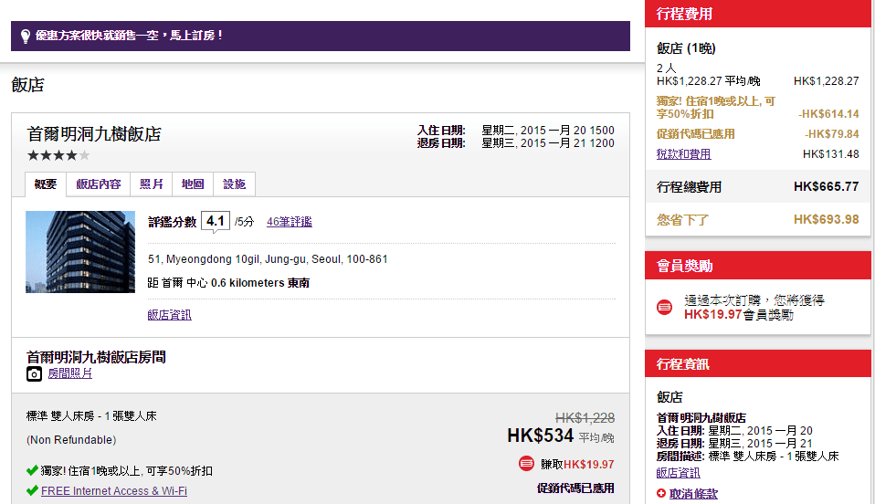 酒店方面,HotelClub而家做緊首爾明洞九樹酒店(Nine Tree Hotel)獨家五折優惠