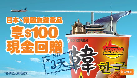 大家只要係12月15日至12月17日買任何日本、韓國機票/酒店/套票都有$100現金回贈