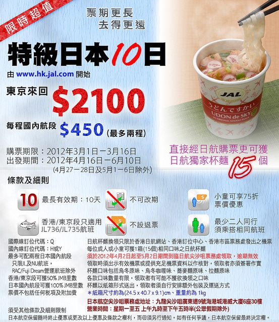 比較特別既係經日航訂票,每位可獲日航獨家杯麵一箱(15個),有4隻口味可以揀,買機票送杯麵真係第一次見!