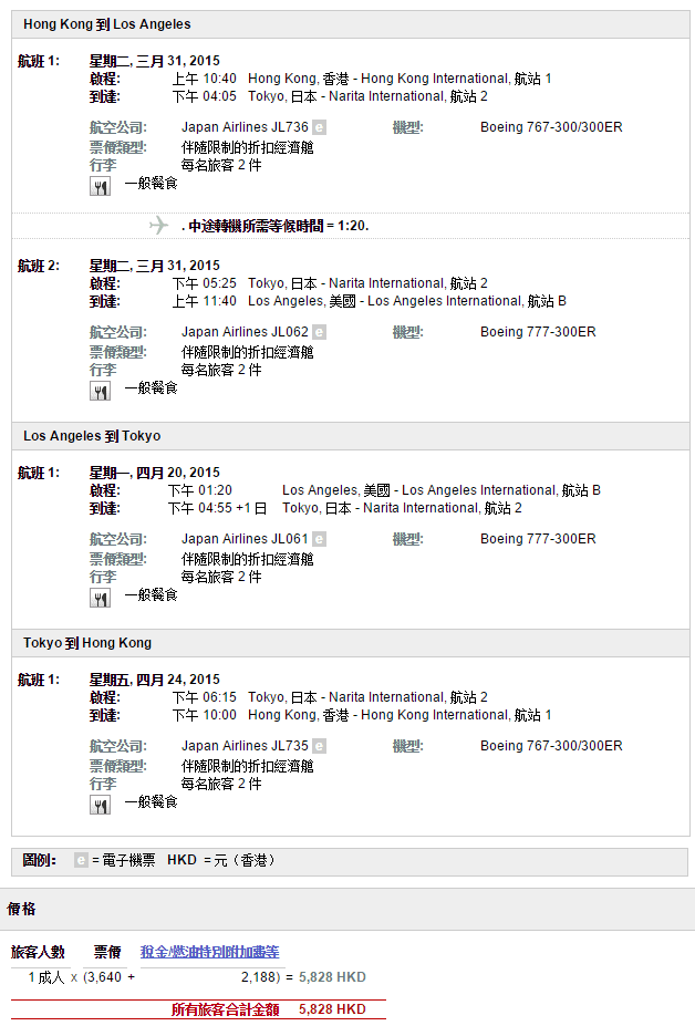 經我們測試,以3月31日出發經東京飛洛杉磯,4月20日洛杉磯飛東京,4月24日東京飛香港