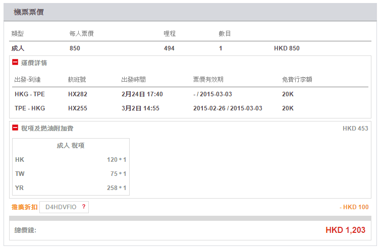 香港往返台北$850,周末熱價減$100後,只需$750,連稅$1,203