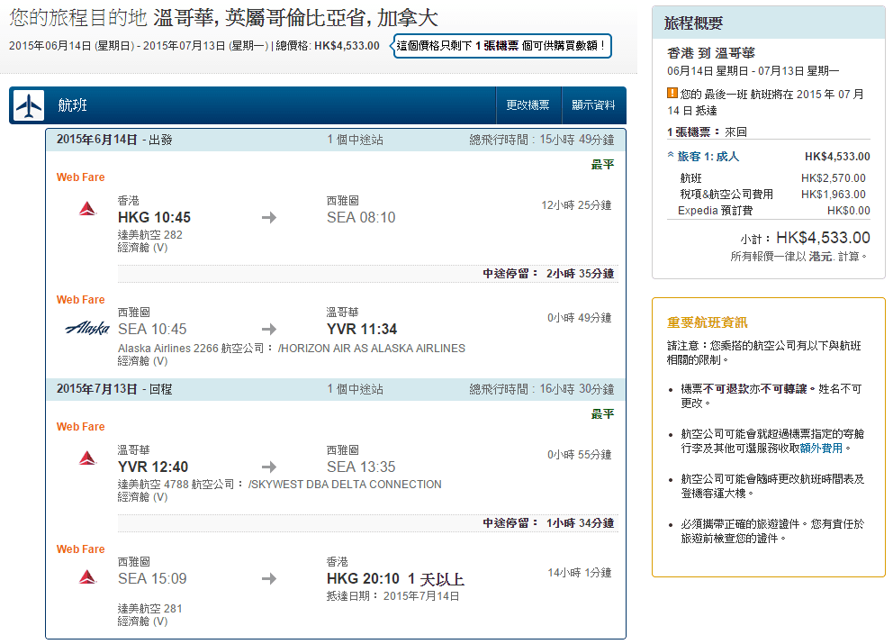 經我們測試,以溫哥華6月14日出發,7月13日返回為例