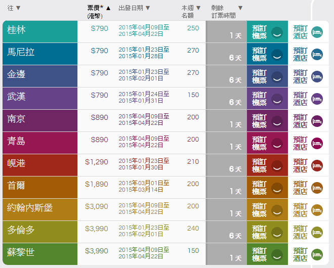 (馬尼拉$790 連稅$1,168)、(桂林$790 連稅$1,282)、(武漢$790 連稅$1,282)、(金邊$790 連稅$1,363)、(南京$890 連稅$1,382)、(青島$890 連稅$1,382)、(峴港$1,290 連稅$1,805)、(首爾$1,890 連稅$2,476)、 (約翰內斯堡$3,090 連稅$4,740)、(蘇黎世$3,990 連稅$5,524)、(多倫多$3,990 連稅$5,602)