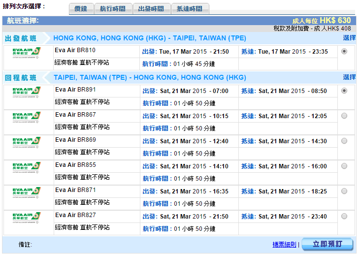 經我們測試,以3月17日出發,3月21日返回為例