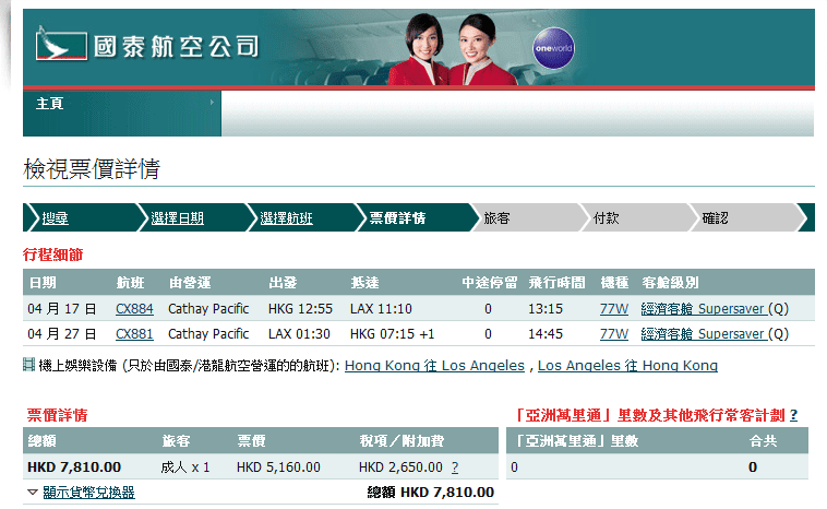 經我們測試,以4月17日出發,4月27日回程 洛杉磯為例