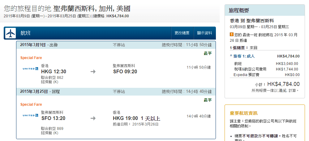 經我們測試,以三藩市3月9日出發,3月25日返回為例