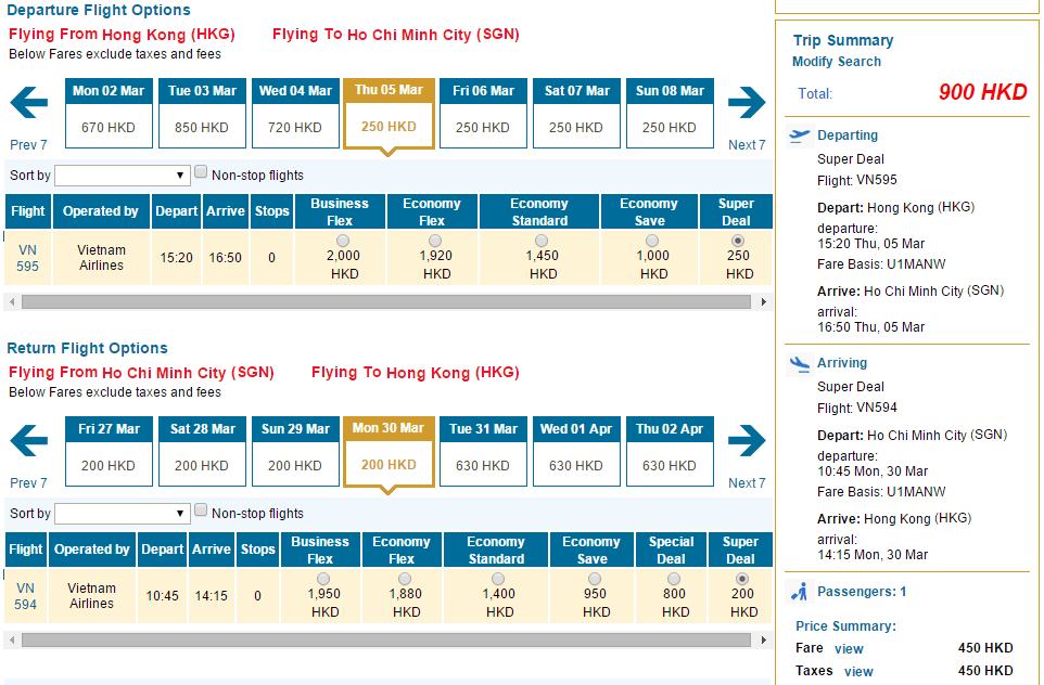 經我們測試,以胡志明市3月5日去,3月30日返為例