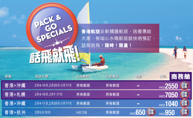 香港往返沖繩$1,040,連稅$1,485;杭州$950,連稅$1,441