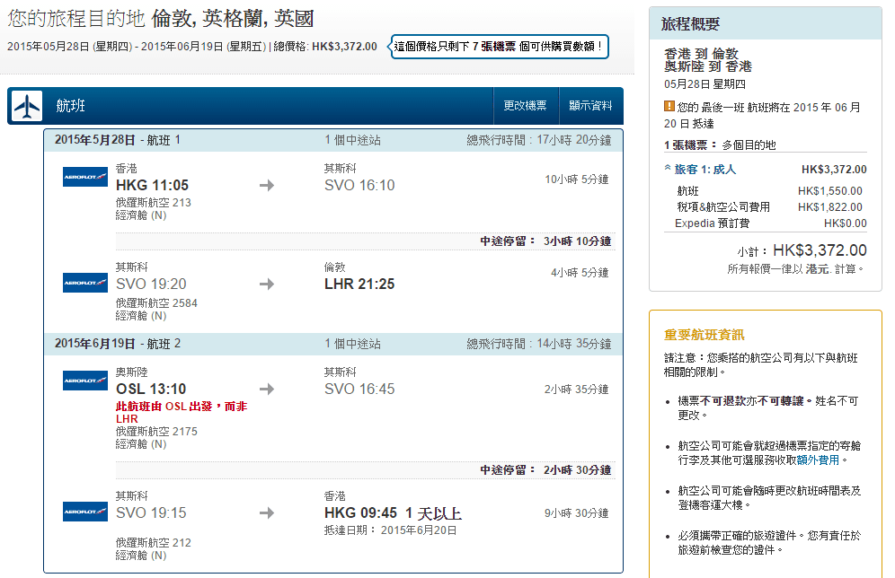 經我們測試,以5月28日倫敦入,6月19日奧斯陸走為例