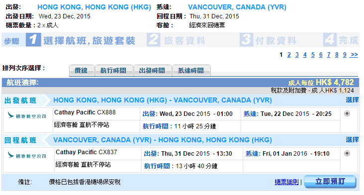 經我們測試,以溫哥華12月23日出發,12月31日返回為例